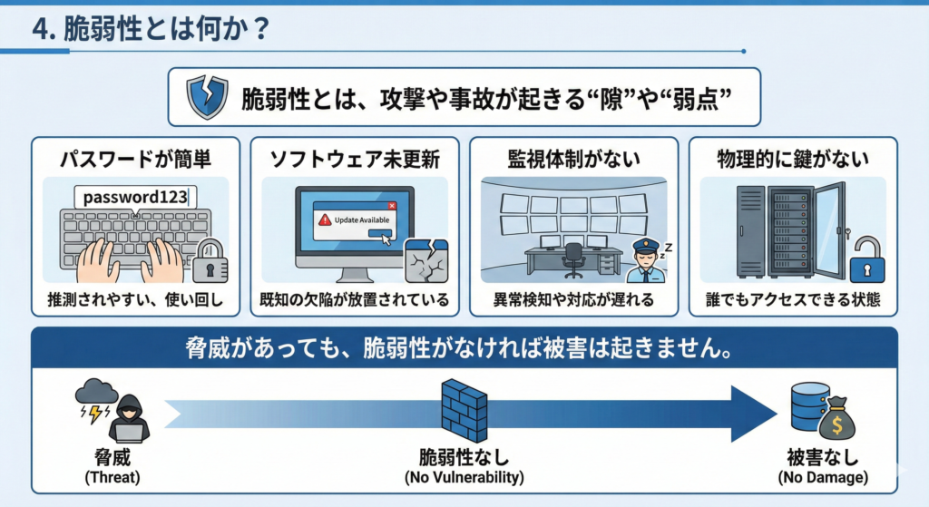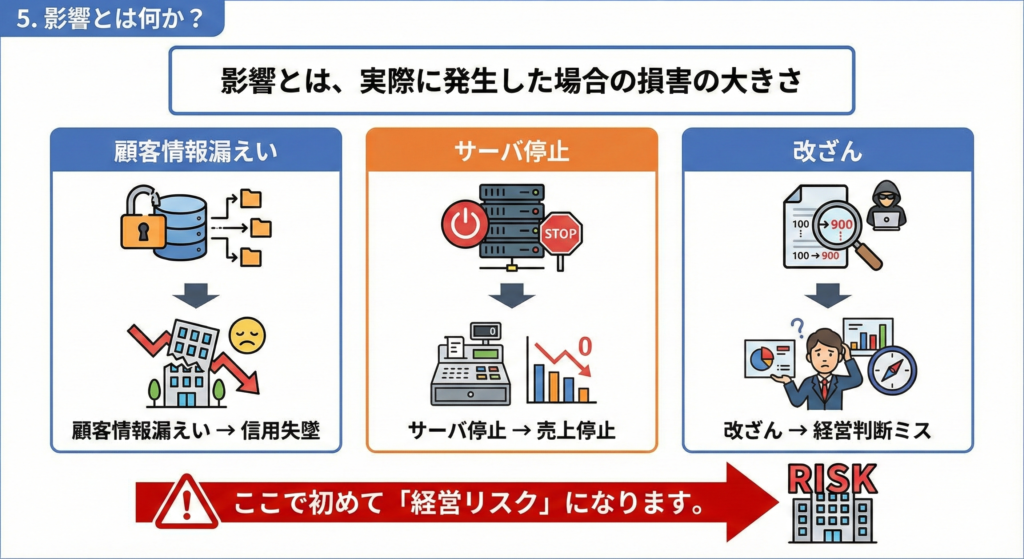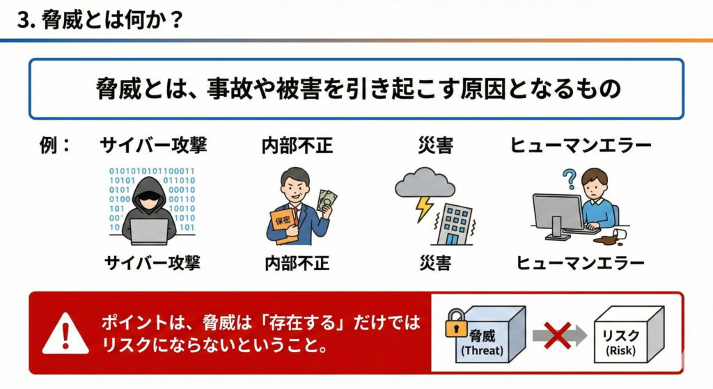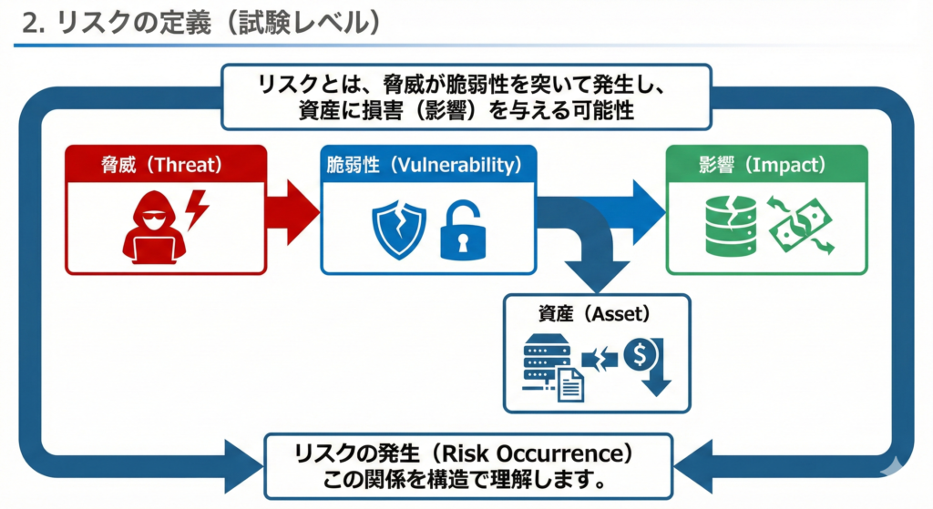 ✔ リスクは「脅威・脆弱性・影響」の組み合わせ