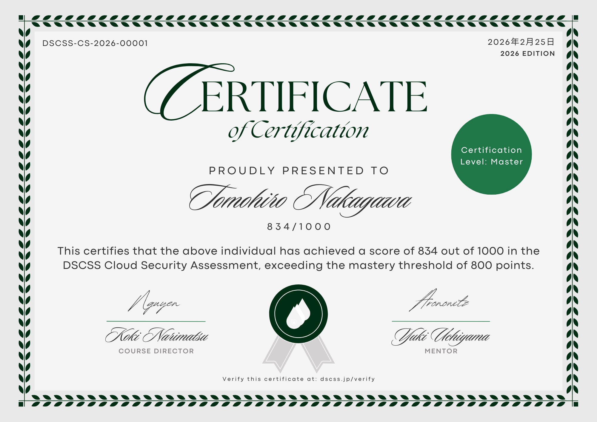 DSCSS(DropStone Cloud Security Study)は、クラウドセキュリティ学習の成果を「見える化」するために、スコアに基づく**公式認定証(Certificate of Certification)**を発行しています。